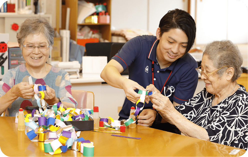 かんべ村身体機能に合わせた「機能訓練介護予防体操」で体を動かしたり、季節行事や趣味などに取り組みながら楽しくお過ごしいただいています。